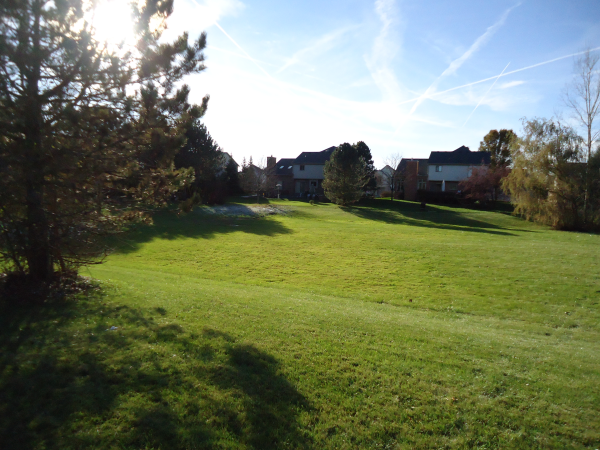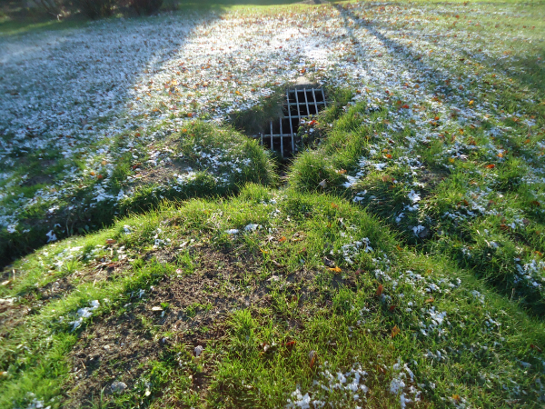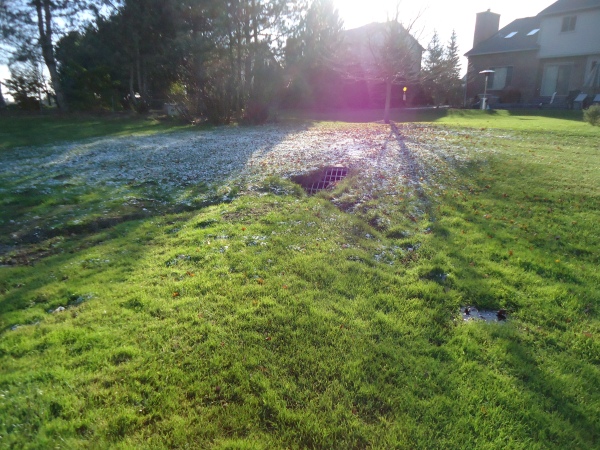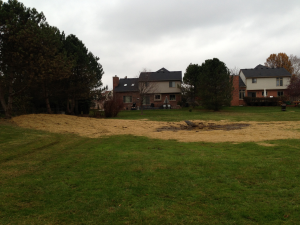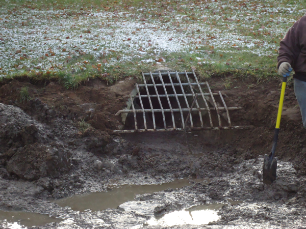 This was a devalopment retention pond in Plymouth, Michigan, and the out let pipe was 70% plugged. We pushed all the built up sediments into the corner of the lot and restored the grass.