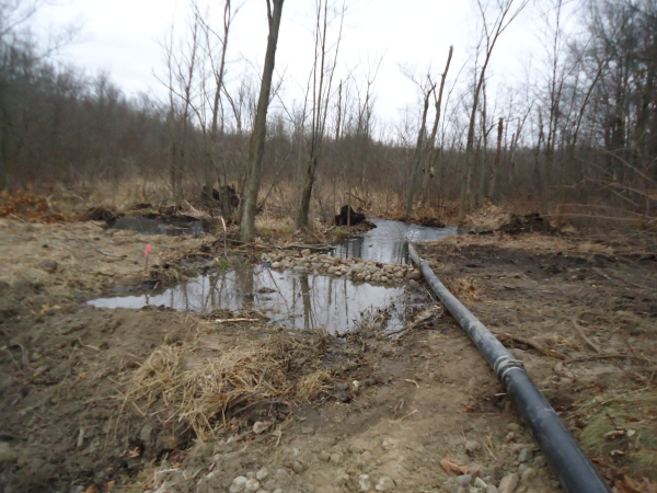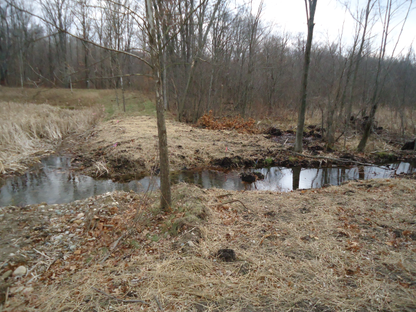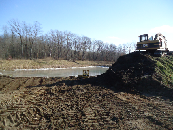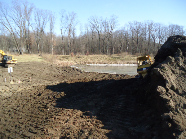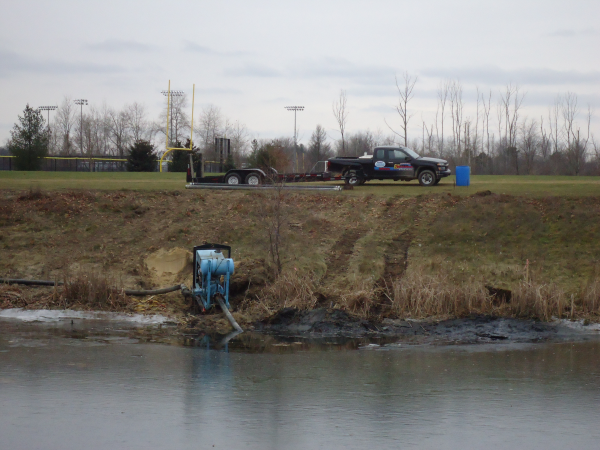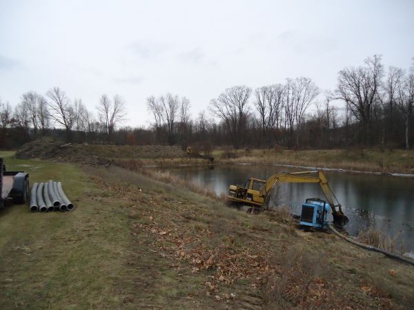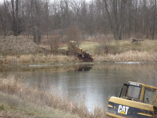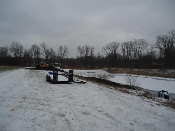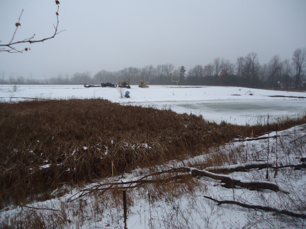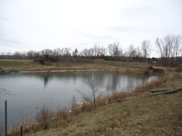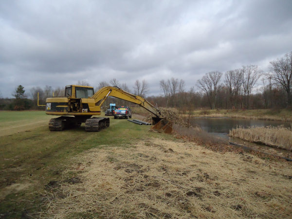 This is the Hartland School district's pond. It needed some wetlands created to balance out some of the work that was done to the soccer fields that destroyed some wetlands. We pushed this naturally fertile and organic material into the pond at water level to create some wetlands.