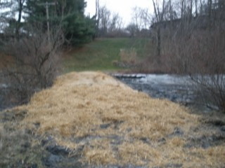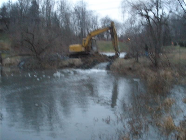 This is two separate ponds joined with an overflow tube, separated by a damn. Muskrats began boring holes in damn and it began failling, and letting water through. We went in and made improvements to the damn and added a much larger overflow tube
